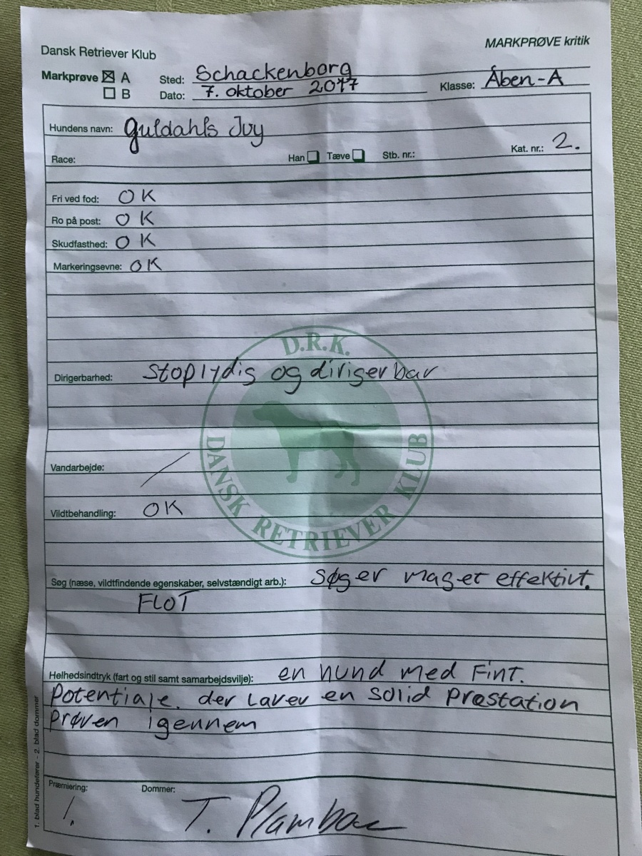 Hele prøven blev gennemført fri ved fod og indledtes med, at der uventet blev skudt og kastet en fugl, som hundene ikke skulle hente. Joey gik superfint fri ved fod, både da distraktionen blev kastet og under hele prøven. Der var 5 opgaver, der skulle løses. Vi startede med 2 dirigeringsopgaver, hvor hunden skulle dirigeres ca. 75 m ud til en fugl, som lå 25 meter før et opsat bånd. Det var diset, og min afstandsbedømmelse var ikke sikker nok. Den anden dirigering lignede den første, men sværhedsgraden bestod i, at adskille de to opgaver, da vinklen ikke var ret stor. Joey løste begge opgaver, men det bliver lidt omstændeligt med en del stop og korrektioner, fordi min afstandsbedømmelse ikke er skarp, og fordi jeg endnu ikke er erfaren nok i den slags krævende opgaver. Dernæst gik vi til et nyt område, hvor der faldt to fugle på linje, og hvor hundene skiftedes til at hente den først kastede og den sidst kastede. For mit vedkommende bliver begge opgaver løst, men igen kræver det en del korrektioner. Den sidste opgave i prøven er en lang dirigering ud til et områdebestemt søg. Det udfordrende er dels afstanden - der er langt - dels at der kun er et begrænset hul i hegnet, så hunden kan meget let blive væk. Jeg synes selv, det var den opgave, Joey og jeg løste bedst. Vi slutter med 46 point, og jeg er super tilfreds med at have gennemført min første vinderklasseprøve.