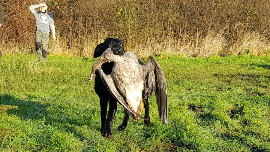 På billedet herunder er det Seaside Gundogs First Shadow, der 5 måneder gammel apporterer en gås.