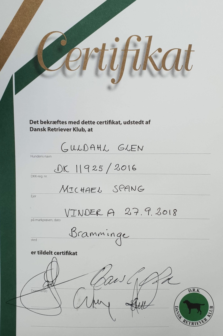 Guldahls Glen 1. vinder med cert. på A-prøven ved Bramminge 27.09.2018