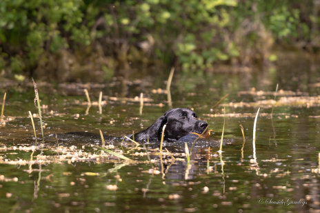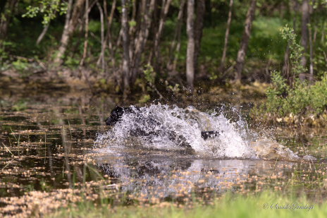 Skøn dag med høj solskin og godt selskab til UWT i Momhøje. I dag var det Key, der gjorde mig selskab på prøven. Key og jeg begynder prøven på Post 1 med en markering på vand: 20 point. Dernæst på Post 2, som er et områdebestemt søg: 19 point. Post 3 - en markering, der lander på den anden side af en bakketop: 20 point. Post 5: En tilbagesendelse til udlagt dummy giver 20 point. Så er der kun post 4 tilbage. Post 4 er en lille tramp. Her får Key ikke markeringen i første hug, så jeg må hjælpe noget. Hun er også lidt urolig, da makkerhunden sendes på sin markering: Helt fortjent får vi 15 point. Samlet rækker vores 94 point til en placering som 2. vinder.